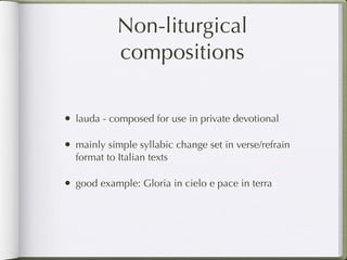 1) Lauda - simple Italian devotional songs composed for private use with a verse/refrain format.