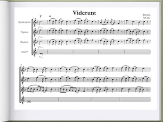 3) Monophonic compositions were divided into four periods including St. Martial known for two-voiced organum styles, Notre Dame known for liturgical works by Léonin and Pérotin, and Ars Antiqua which continued with rhythmically active upper parts set to French texts over chant-based lower parts.
