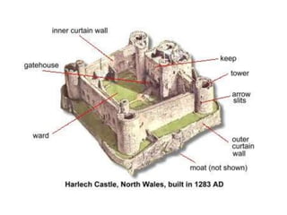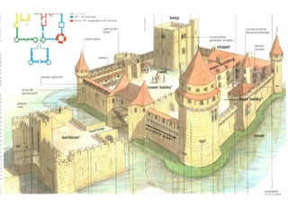 This document lists several medieval castles including the Tower of London in England, Chateau d'Amboise in France, Bodiam Castle and Eilean Donan Castle in Scotland, and Loarre Castle in Spain. It also provides a link for more information about medieval castle parts and design.