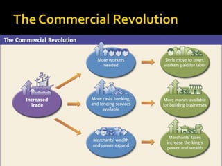 The document summarizes changes in Europe between the 11th and 12th centuries, including the decline of feudalism and rise of trade, towns, and universities. The growth of trade and towns shifted Europe's economic foundation from agriculture. Italian cities like Venice, Florence, and Genoa led the way in trade. Craft workers began producing goods for European-wide trade, and guilds organized to regulate trades and provide training. Larger towns and cities developed, gaining independence from feudal lords. Conditions in early medieval towns were unsanitary due to waste disposal and narrow streets, though towns continued growing due to expanded trade and wealth.