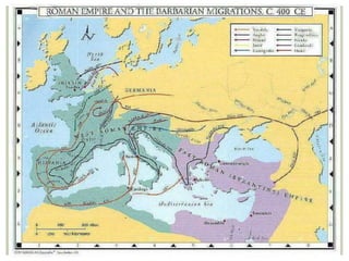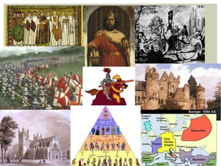 The document provides an overview of the Middle Ages in Europe from the 5th century to the 15th century. It describes this period as between the fall of the Western Roman Empire and the Renaissance. The Middle Ages are divided into the Early or Low Middle Ages, characterized by the Dark Ages following the fall of Rome, and the Late or High Middle Ages, marked by events like the Black Plague and Magna Carta. The document outlines the rise of feudalism and the Catholic Church's influence during this time, as well as developments like the Crusades, monasticism, and the Byzantine and Holy Roman Empires.