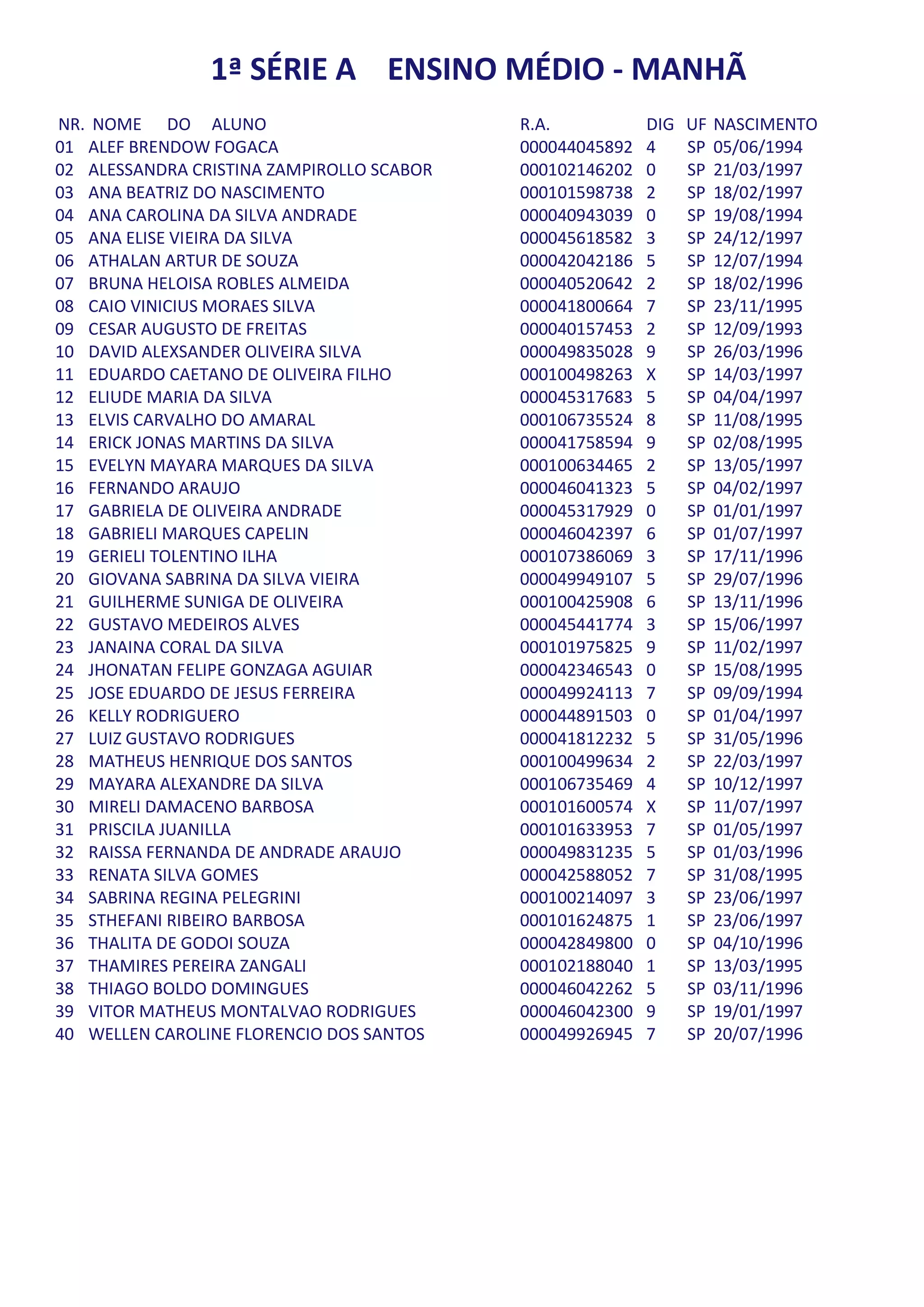 ENSINO MÉDIO - MANHÃ NR. NOME DO ALUNO R.A. DIG UF NASCIMENTO 01 ALEF BRENDOW FOGACA 000044045892 4 SP 05/06/1994 02 ALESSANDRA CRISTINA ZAMPIROLLO SCABOR 000102146202 0 SP 21/03/1997 03 ANA BEATRIZ DO NASCIMENTO 000101598738 2 SP 18/02/1997 04 ANA CAROLINA DA SILVA ANDRADE 000040943039 0 SP 19/08/1994 05 ANA ELISE VIEIRA DA SILVA 000045618582 3 SP 24/12/1997 06 ATHALAN ARTUR DE SOUZA 000042042186 5 SP 12/07/1994 07 BRUNA HELOISA ROBLES ALMEIDA 000040520642 2 SP 18/02/1996 08 CAIO VINICIUS MORAES SILVA 000041800664 7 SP 23/11/1995 09 CESAR AUGUSTO DE FREITAS 000040157453 2 SP 12/09/1993 10 DAVID ALEXSANDER OLIVEIRA SILVA 000049835028 9 SP 26/03/1996 11 EDUARDO CAETANO DE OLIVEIRA FILHO 000100498263 X SP 14/03/1997 12 ELIUDE MARIA DA SILVA 000045317683 5 SP 04/04/1997 13 ELVIS CARVALHO DO AMARAL 000106735524 8 SP 11/08/1995 14 ERICK JONAS MARTINS DA SILVA 000041758594 9 SP 02/08/1995 15 EVELYN MAYARA MARQUES DA SILVA 000100634465 2 SP 13/05/1997 16 FERNANDO ARAUJO 000046041323 5 SP 04/02/1997 17 GABRIELA DE OLIVEIRA ANDRADE 000045317929 0 SP 01/01/1997 18 GABRIELI MARQUES CAPELIN 000046042397 6 SP 01/07/1997 19 GERIELI TOLENTINO ILHA 000107386069 3 SP 17/11/1996 20 GIOVANA SABRINA DA SILVA VIEIRA 000049949107 5 SP 29/07/1996 21 GUILHERME SUNIGA DE OLIVEIRA 000100425908 6 SP 13/11/1996 22 GUSTAVO MEDEIROS ALVES 000045441774 3 SP 15/06/1997 23 JANAINA CORAL DA SILVA 000101975825 9 SP 11/02/1997 24 JHONATAN FELIPE GONZAGA AGUIAR 000042346543 0 SP 15/08/1995 25 JOSE EDUARDO DE JESUS FERREIRA 000049924113 7 SP 09/09/1994 26 KELLY RODRIGUERO 000044891503 0 SP 01/04/1997 27 LUIZ GUSTAVO RODRIGUES 000041812232 5 SP 31/05/1996 28 MATHEUS HENRIQUE DOS SANTOS 000100499634 2 SP 22/03/1997 29 MAYARA ALEXANDRE DA SILVA 000106735469 4 SP 10/12/1997 30 MIRELI DAMACENO BARBOSA 000101600574 X SP 11/07/1997 31 PRISCILA JUANILLA 000101633953 7 SP 01/05/1997 32 RAISSA FERNANDA DE ANDRADE ARAUJO 000049831235 5 SP 01/03/1996 33 RENATA SILVA GOMES 000042588052 7 SP 31/08/1995 34 SABRINA REGINA PELEGRINI 000100214097 3 SP 23/06/1997 35 STHEFANI RIBEIRO BARBOSA 000101624875 1 SP 23/06/1997 36 THALITA DE GODOI SOUZA 000042849800 0 SP 04/10/1996 37 THAMIRES PEREIRA ZANGALI 000102188040 1 SP 13/03/1995 38 THIAGO BOLDO DOMINGUES 000046042262 5 SP 03/11/1996 39 VITOR MATHEUS MONTALVAO RODRIGUES 000046042300 9 SP 19/01/1997 40 WELLEN CAROLINE FLORENCIO DOS SANTOS 000049926945 7 SP 20/07/1996