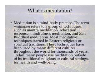 The document discusses meditation as a mind-body practice that originated in Eastern religious traditions but is now commonly used for health and well-being outside of religious contexts. It provides an overview of why people meditate (for conditions like stress, anxiety, depression), how to meditate (focusing on breathing or a mantra), and the benefits (improved attention, brain function, mood regulation). Different types of meditation are described including mindfulness meditation and Transcendental Meditation.