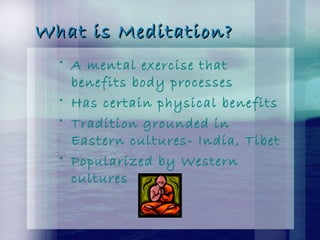 The document discusses different types of meditation. It begins by defining meditation as a mental exercise that benefits the body and mind. It notes that meditation originated in Eastern cultures like India and Tibet but has been popularized in the West. The document then covers various meditation techniques like Transcendental Meditation and different forms like concentrative, mindfulness, and others. It discusses the physiological and psychological benefits of meditation that have been shown by research studies. These include reduced stress, anxiety, and depression as well as effects on the brain, heart, and relaxation response. The document concludes with tips on how to meditate regularly and effectively.