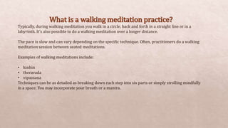 Walking meditation involves walking slowly while being mindful of body sensations and breath. It can be done in a variety of ways such as walking in circles, straight lines, or labyrinths. Walking meditation provides benefits such as boosting blood flow, improving digestion, reducing anxiety, and enhancing mood. Regular practice of walking meditation has been shown to improve health outcomes for conditions like diabetes, depression, and balance.