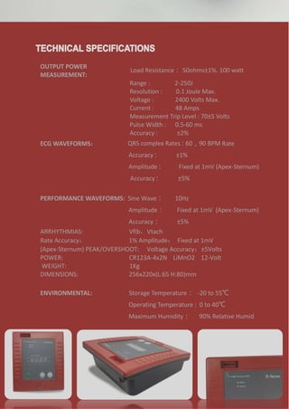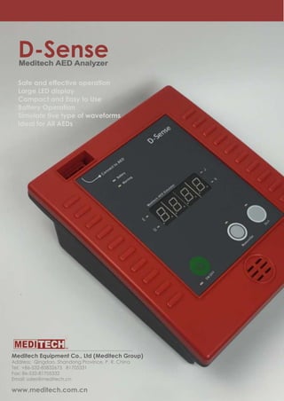 The document describes a d-sense device designed for safe and effective operation of large LED displays, specifically for AEDs and related medical equipment. It includes detailed specifications such as output power, measurements, ECG waveform characteristics, and environmental conditions. The product is compact, battery-operated, and suitable for various medical applications.