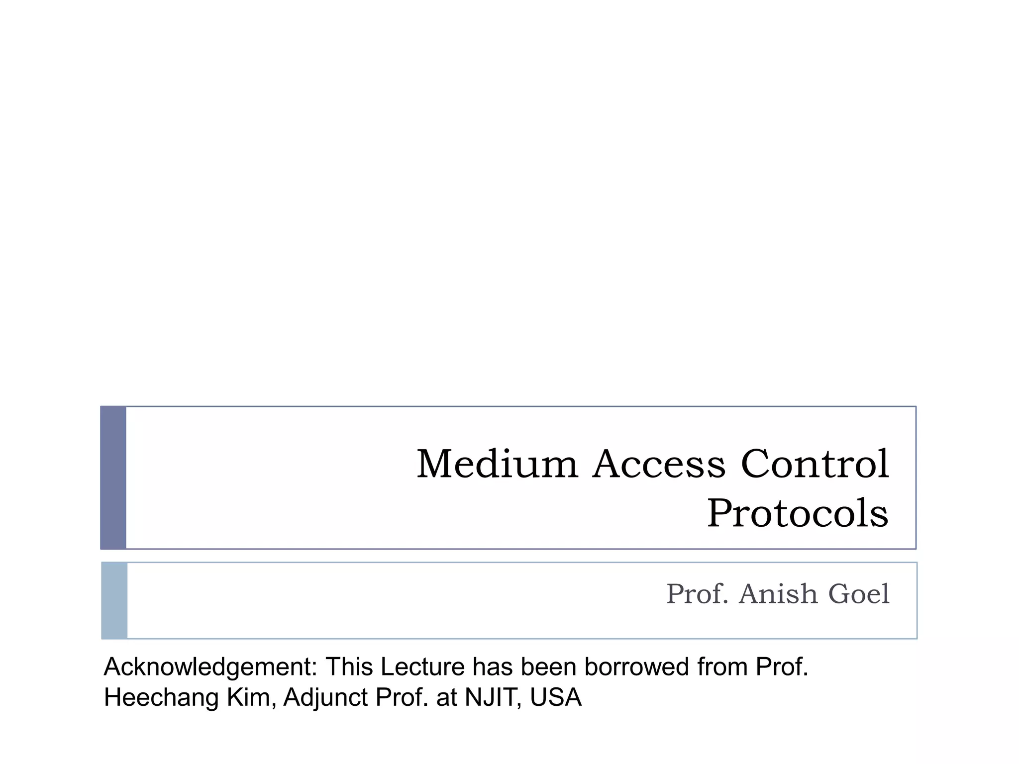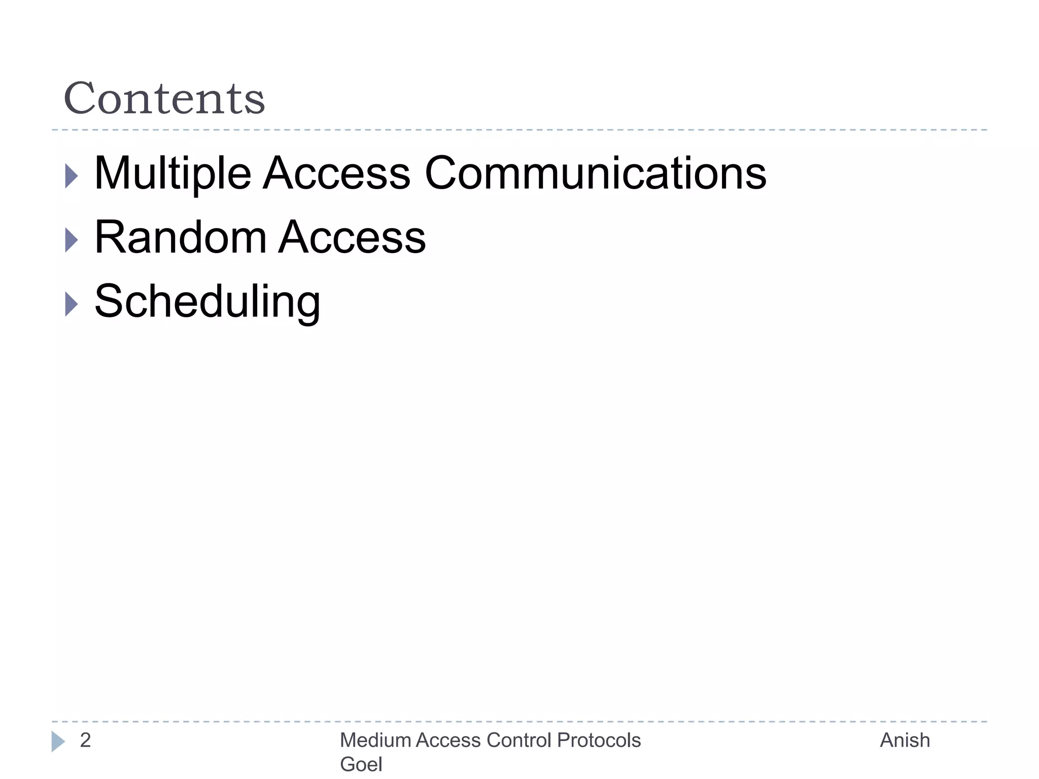 This document discusses different medium access control protocols. It covers random access protocols like ALOHA and slotted ALOHA, carrier sensing protocols like CSMA and CSMA/CD, and scheduling protocols like polling and token passing. It provides analysis of the throughput and efficiency of these different MAC protocols. It also compares the approaches and discusses factors in selecting a MAC protocol.