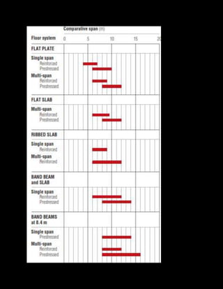 This document discusses various reinforced concrete floor systems for medium and long span structures. It describes objectives like minimizing floor-to-floor height, maximizing column-free spaces, minimizing weight and construction time. Systems covered include flat slabs with drop panels, flat plates, ribbed slabs, waffle slabs, and band beams & slabs. Each system is summarized briefly, including advantages like simple formwork, long spans, and material savings, as well as disadvantages like depth controlling fire rating and need for specialized formwork. Reinforcement details to improve slab punching shear resistance are also mentioned.