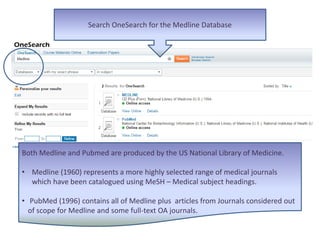 Medline is a highly selective database of medical literature produced by the US National Library of Medicine. It indexes reputable medical journals using controlled vocabulary terms called Medical Subject Headings (MeSH) to catalog articles. MeSH terms allow searching by concept and building complex search strategies with Boolean operators. Search results can be refined based on study type, population, and other limits.