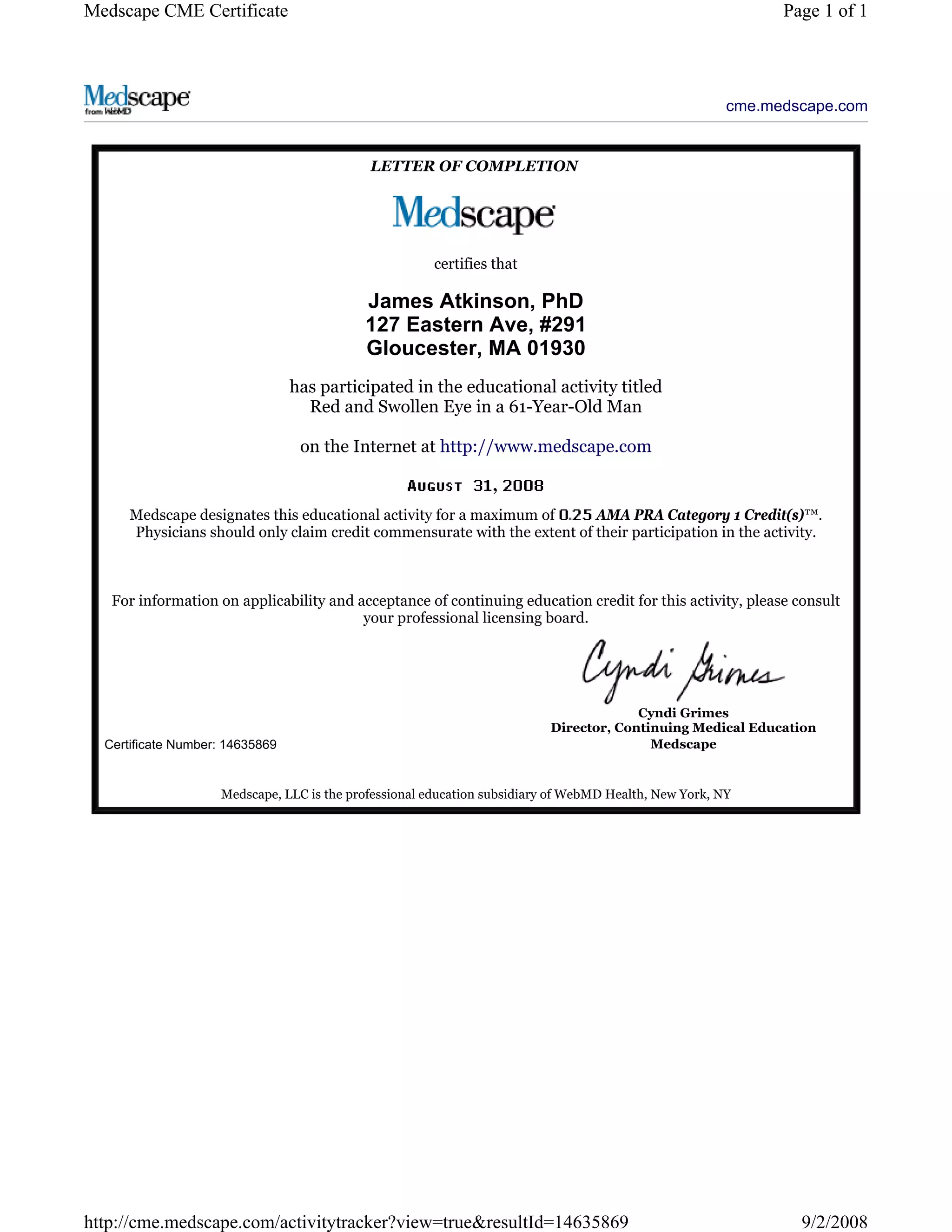 James Atkinson, a PhD from Gloucester, MA, completed an online continuing medical education activity through Medscape titled "Red and Swollen Eye in a 61-Year-Old Man". Medscape has designated this educational activity for up to 1 AMA PRA Category 1 Credit and issued James Atkinson certificate number 14635869 for participating in and completing the online course on diagnosing and treating red and swollen eyes.