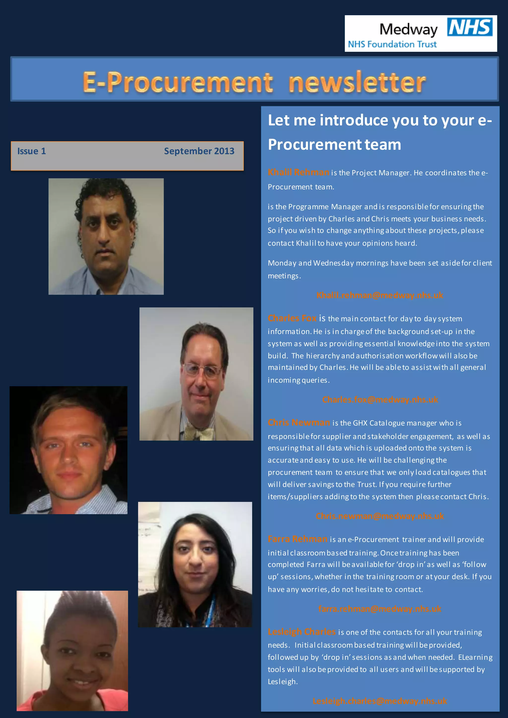 The document introduces the e-Procurement team members and their roles at Medway Maritime Hospital. It provides contact information for each team member, including Khalil Rehman as the Project Manager, Charles Fox for system information, Chris Newman for supplier engagement and catalogues, Farra and Lesleigh Charles for training, and is responsible for ensuring the project meets business needs. It then summarizes the hospital departments that have gone live with the eProcurement system, the roll out plan for future departments, and addresses common questions about using the new eProcurement system.