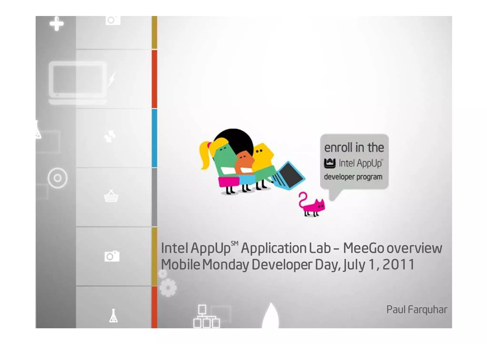 The document discusses Intel's AppUp application store coming to the MeeGo operating system. It provides an overview of the MeeGo architecture and ecosystem, describes Intel's AppUp developer program and SDK for creating apps for MeeGo, and encourages developers to join the program.
