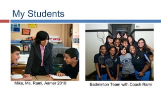The document discusses Meenoo Rami, an English teacher at Science Leadership Academy in Philadelphia. It provides statistics from surveys of her students that show they are part of the Millennial generation, who are highly technology literate and use computers and cell phones regularly. The surveys found that most students want to use technology more in school and believe computer proficiency is important. The document also discusses how Rami uses blogs and social media like Twitter to connect with students and other teachers for professional development opportunities.