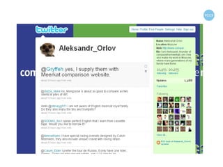 1. The document outlines Aleksandr's 5 Simples of Social Media Marketing, which are to use social media as well as traditional media, have one core idea across multiple connected platforms, give people things to discuss, remember the ratio of ears to mouth, and choose where to play based on brand narrative and utility.