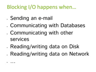 Steve Maraspin gave a presentation on asynchronous and parallel PHP. He began by demonstrating how blocking I/O calls can slow down PHP applications and presented several approaches to address this issue including asynchronous calls, message queues, job servers, forking processes, stream_select, libevent, and React. He discussed the pros and cons of each approach and provided code examples. He concluded by discussing additional asynchronous options for PHP like Hack and Node.js and thanked the audience.