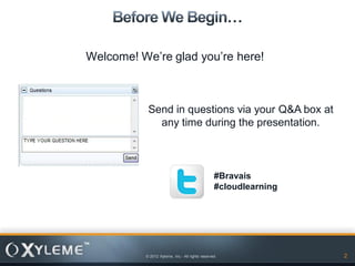 The document is a presentation by Xyleme, Inc. about their new learning platform called Bravais. Bravais aims to address limitations of traditional LMSs by delivering personalized, just-in-time learning across any device. It utilizes a cloud-based content repository that allows for granular assembly and delivery of learning objects. Key features include personalized recommendations, social learning features, and tools for content creation and management.