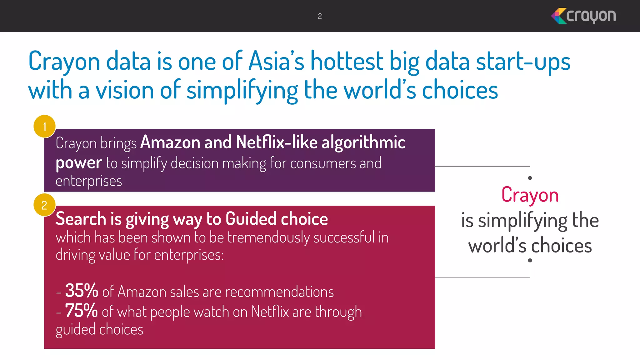 Crayon Data is an Asian big data startup that aims to simplify decision making for consumers and enterprises using recommendation algorithms. Their Choice Engine platform, SimplerChoices, analyzes taste and interest graphs to provide personalized recommendations that have driven significant value for clients. Some early clients include a hotel chain that increased repeat customers 3x and a payments company that improved lead qualification rates by 50-100% using the platform. Crayon Data was selected as a finalist for the CODE_n award at CeBIT 2014 for their work in driving the data revolution.