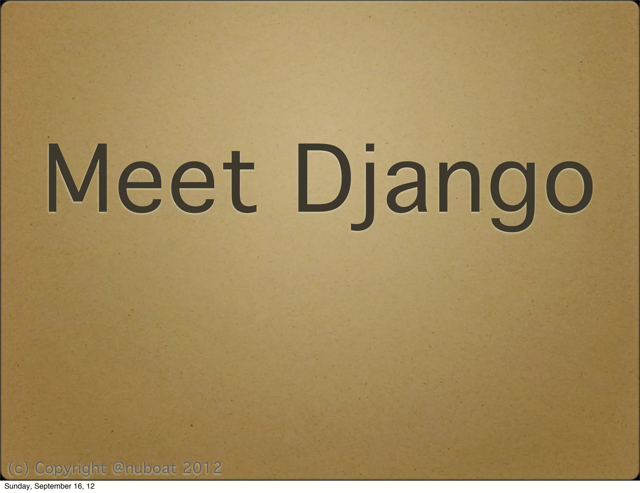 The document introduces the Django web framework. It highlights that Python is a beautiful language, and Django allows for fast development and fast web applications. It then outlines the basic steps for creating a Django project, including setting up files for settings, URLs, templates, models, and the admin interface.