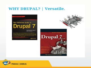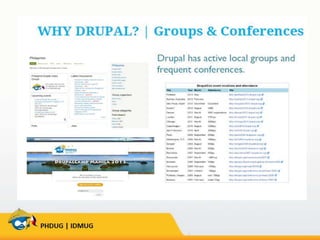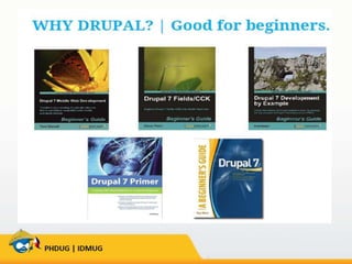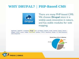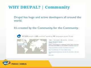 Drupal is an open source content management system (CMS) that began as a college bulletin board. It has been in development since 2001 and is driven by an ever-growing community. Some key benefits of Drupal include its free and open source nature, powerful and flexible platform, clean URLs, and ability to customize functionality. The document provides tips for getting involved with the Drupal community through roles like contributing modules, event organizing, or starting a Drupal company. It outlines 10 steps for advancing one's career in Drupal, including getting involved, being open to feedback, and learning from both successes and failures.