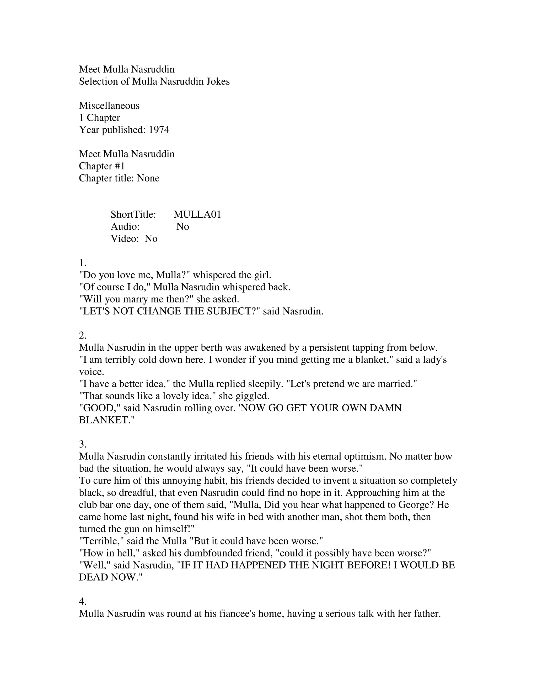 Mulla Nasrudin is a character known for his witty jokes and stories. The document contains 40 short anecdotes about Mulla Nasrudin and the humorous situations and exchanges he finds himself in, often with his wife or others. The anecdotes demonstrate his clever use of wordplay, unexpected responses, and ability to turn situations around on others through his quick thinking.