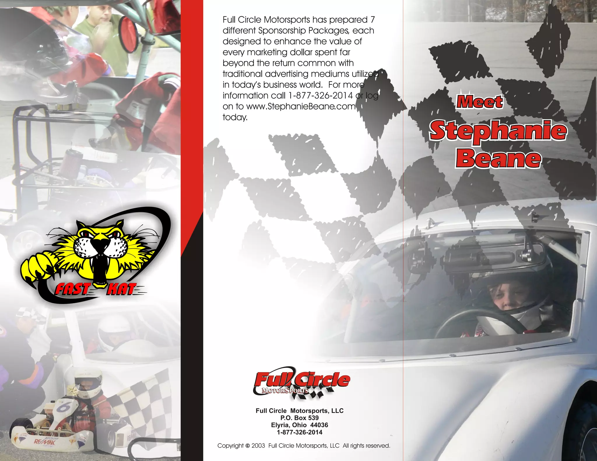 Full Circle Motorsports has prepared 7 sponsorship packages to enhance marketing returns beyond traditional advertising. The packages are designed to build long-term relationships by sponsoring talented young athletes like 9-year-old racing prodigy Stephanie Beane. Stephanie has already won 11 races and shown commitment through early morning practices and technical study. She aims to start her first NASCAR Cup race on her 18th birthday in 2014. Sponsoring her now could yield immeasurable long-term benefits through branding and relationship building, unlike missed opportunities with past champions like Jeff Gordon.