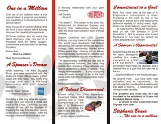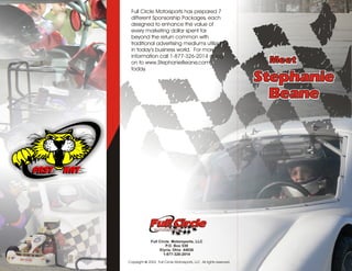 Full Circle Motorsports has prepared 7 sponsorship packages to enhance marketing returns beyond traditional advertising. They offer opportunities to partner with young racing talent Stephanie Beane, who at age 9 has already won races and tracks her progress towards racing in NASCAR by age 18. The packages allow sponsors to get involved with Stephanie's career from an early age, which could result in immeasurable long-term benefits like lifelong brand recognition, as seen in examples with companies and famous athletes like Jeff Gordon and Tiger Woods. Interested sponsors should contact Full Circle Motorsports.