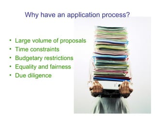 The document provides information about applying for funding from a trust. It outlines the application process which includes pre-application research, formulating a proposal, proposal assignment and assessment, and a final decision. Key steps are researching eligibility, ensuring the proposal clearly demonstrates how it meets the fund's criteria, and being prepared to provide additional information and participate in monitoring and evaluation if awarded funding. Strong proposals are concise, tailored to the specific fund, and show impact.