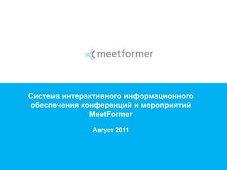 Meetformer — это система интерактивного информационного обеспечения для конференций и мероприятий, направленная на повышение эффективности общения между участниками. Система предлагает функции оповещения, рекомендации полезных контактов и упрощает процесс знакомства через SMS и мониторы. Участники могут зарегистрироваться и получать информацию о других присутствующих, что позволяет наладить более продуктивные связи на мероприятии.