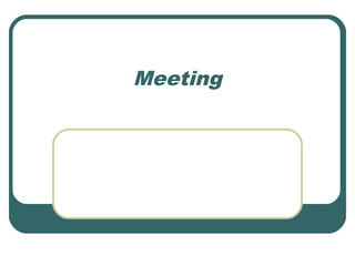 This document discusses meetings, including definitions, types, purposes, advantages, disadvantages, and requirements for a valid meeting. A meeting is defined as an assembly of two or more people to reach decisions through discussion. Common types include formal, informal, private, and public meetings. Main purposes are to discuss issues, announce information, review projects, and celebrate successes. Advantages include sharing ideas and knowledge, while disadvantages include time costs and difficulty controlling large groups. Requirements for a valid meeting include proper notice, agenda, chairman, quorum, and minutes.
