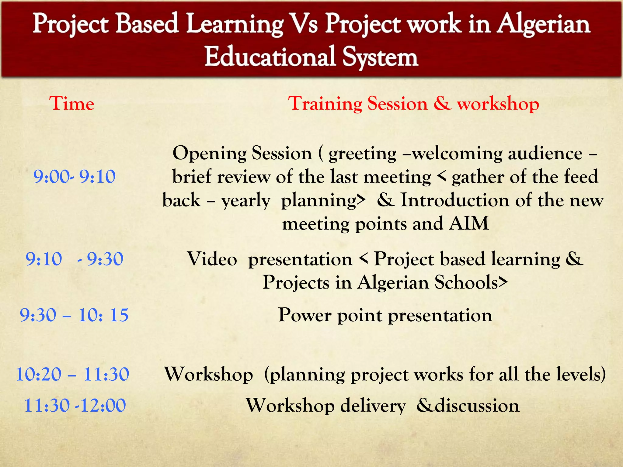 The document outlines an agenda for a time training session and workshop. It includes an opening session, video presentation, powerpoint presentation, and two workshop sessions. The first workshop involves planning project works for different levels. The second workshop covers project work delivery and discussion. The document then provides information on defining themes, outcomes, structuring, skills, gathering information, analyzing, presenting, and evaluating project work. It describes project work as involving multi-skill activities focused on a theme of interest. Learners work together over several days or weeks both inside and outside the classroom. The document also notes some common reasons why teachers may avoid project work, such as lack of time.