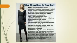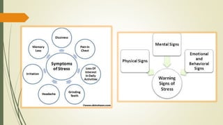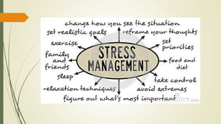 The document discusses stress, its nature, types, sources and effects. It describes the General Adaptation Syndrome which outlines the body's three stages in response to stress - alarm, resistance, and exhaustion. Stress can have emotional, physiological, cognitive, and behavioral effects and weaken the immune system. Coping strategies discussed include task-oriented, emotion-oriented, and avoidance-oriented approaches as well as relaxation techniques, meditation, biofeedback, exercise, assertiveness, time management, and rational thinking. Prolonged or high levels of stress can lead to illness.