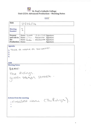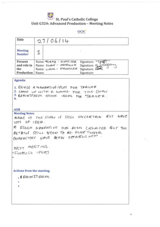 This document contains meeting notes from multiple production meetings for an advanced production unit. Key details discussed include choosing a name for the show, finalizing creative elements like characters and locations, and logistical planning for the performance. Actions items typically involved final assignments or tasks leading up to the show. The meetings covered the progression of the production from early ideation through the final preparations.