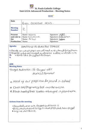The document contains meeting notes from several production meetings at St. Pauls Catholic College. Key discussion points included finalizing the script, completing costume designs, and deciding responsibilities for lighting and sound. Actions from the meetings were to lock in the final script, discuss budgets for new equipment, and schedule a technical walkthrough.