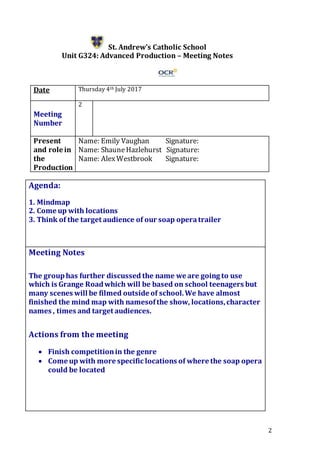 The document contains 16 meeting notes from a group creating a soap opera trailer. Over the meetings, they generated story ideas, decided on a name (Grange Road), developed characters, mapped locations, wrote a script and storyboard, acquired props and permission to film, and planned additional promotional materials like a magazine. Their process involved ongoing planning, task assignments, and updates on completed and upcoming work.