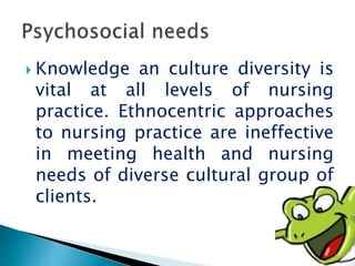 This document discusses cultural diversity in nursing practice. It states that knowledge of culture and cultural diversity is vital for nurses in meeting the needs of diverse clients. It also discusses how cultural concepts of illness, wellness, and treatment come from a cultural perspective. Cultural diversity in nursing derives from various disciplines including nursing, anthropology, sociology, and psychology. Cultural diversity refers to differences between people based on shared beliefs, norms, customs, and meanings that make up a way of life.