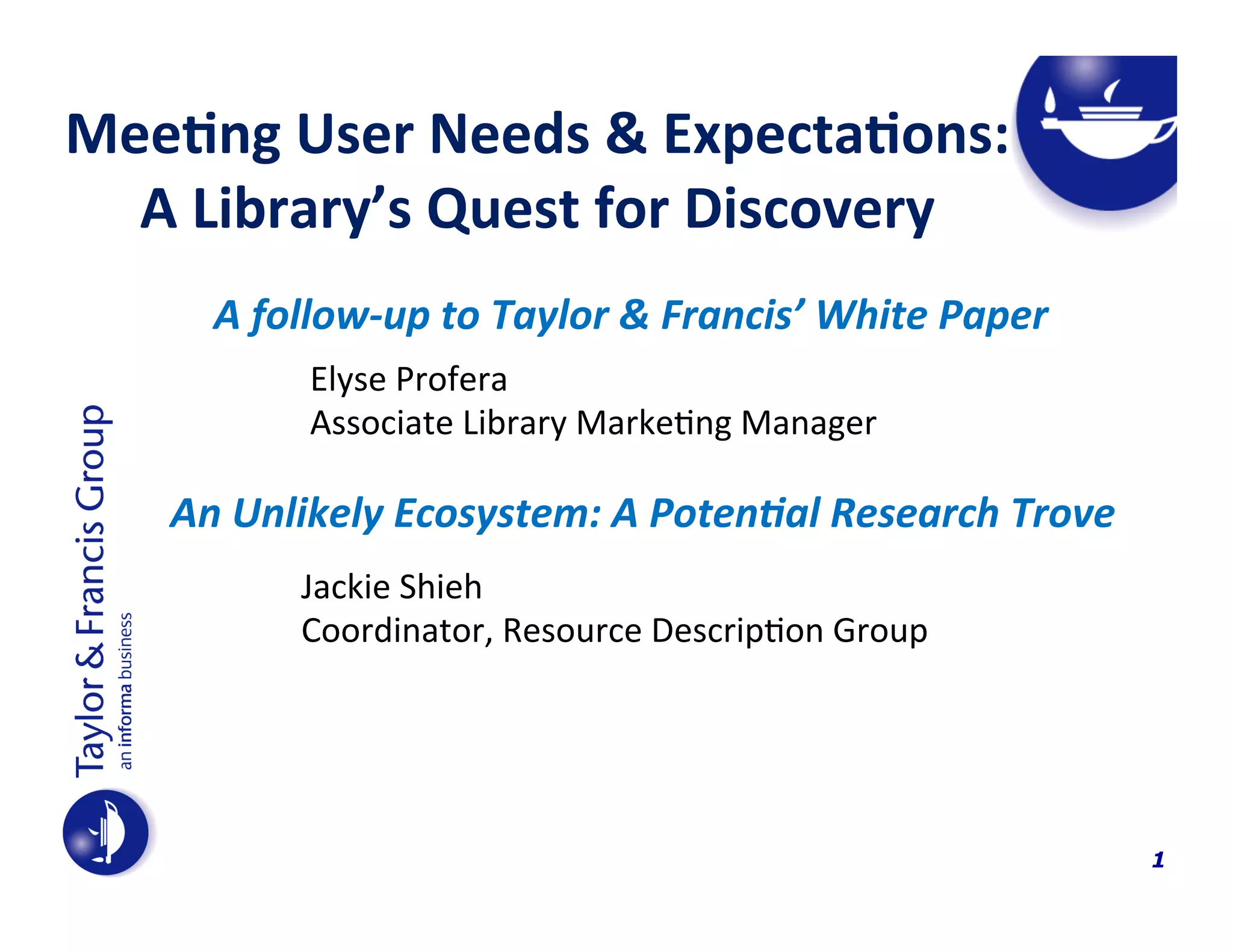 The document summarizes findings from surveys conducted by Taylor & Francis to understand how libraries are adapting to changing user needs and expectations. Key findings include that 68% of libraries have or plan to change their user interfaces based on user research. Libraries are also increasing their use of social media, especially Facebook and Twitter, to promote resources. Publishers can help with discovery by making paid content more discoverable on library websites and enhancing search capabilities.