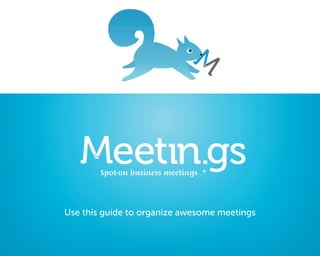 This guide provides instructions for using Meetin.gs, an online tool for organizing meetings. It allows users to create shared online spaces for meetings including files, documents, notes and agendas. Participants are kept up-to-date via email and can use existing tools like smartphones to access meetings. The guide outlines how to setup and schedule meetings, add materials and invite participants, take comments, and use other features like address books and email updates.