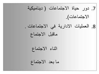 الاجتماعات هي عملية منظمة تتضمن تبادل المعلومات والأفكار بين مجموعة من الأفراد بهدف تحقيق نتائج محددة. تشمل الوثيقة تعريف الاجتماعات، أهميتها، أدوار الأعضاء، وأنواع الاجتماعات، وتتناول كيفية إدارتها بشكل فعال لتحسين جودة الإنتاجية والتعاون بين الأفراد. كما توضح الوثيقة الديناميكيات التي تمر بها الاجتماعات وكيف تؤثر على عملية اتخاذ القرار داخل المجموعات.