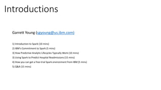 - An example is presented on using Spark to predict hospital readmissions from diabetes patient data, obtaining AUC scores comparable to other published models.
