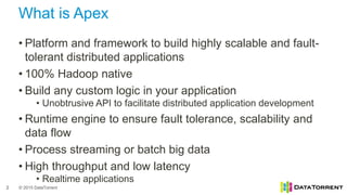 - Apache Apex is a platform and framework for building highly scalable and fault-tolerant distributed applications on Hadoop.