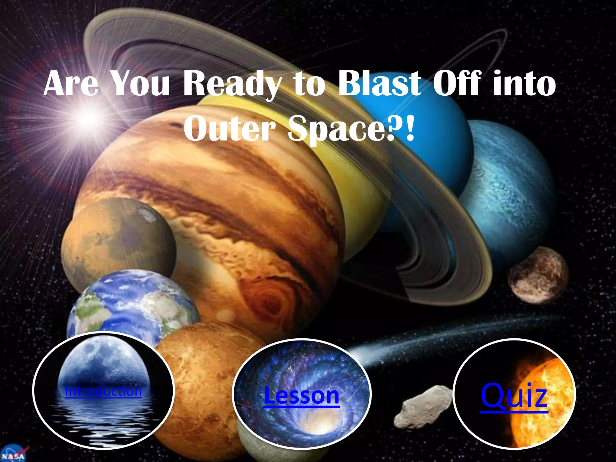 This document is a lesson about the planets in our solar system. It begins by introducing the topic and overviewing the learning goals, which are to recognize the eight planets, know their order and distinguishing characteristics. The lesson then goes through each planet one by one, providing 2-3 facts about Mercury, Venus, Earth, Mars, Jupiter, Saturn, Uranus and Neptune. It concludes with a short quiz to test understanding.