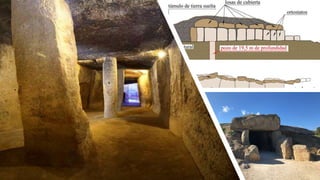 This document discusses various types of megaliths, large prehistoric stone structures found across Europe. It describes dolmens, structures made of large upright stones supporting flat capstones, and mentions the Dolmen of Menga, one of the largest in Europe. It also discusses menhirs, single upright standing stones, and alignments of multiple menhirs. Some of the most famous alignments are located at Carnac, France, consisting of nearly 3,000 standing stones arranged in long rows. Megaliths such as Stonehenge and Avebury were built as circular arrangements of stones and may have served ceremonial purposes related to astronomy.