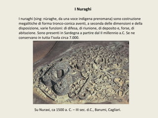 Il documento esplora il megalitismo, con particolare focus su strutture come i nuraghi in Sardegna, i menhir e i dolmen, evidenziando la loro funzionalità e le loro origini storiche. Descrive anche le diverse formazioni megalitiche, come gli allineamenti di Carnac e i cròmlech, sottolineando l'importanza rituale e funeraria di queste costruzioni. Infine, menziona monumenti specifici come il menhir di Kerloas e il dolmen di Crucuno, fornendo dettagli sulle loro dimensioni e ubicazione.
