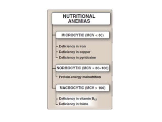 This document discusses megaloblastic anemias caused by cobalamin and folate deficiencies. It covers the absorption, transport, biochemical functions and deficiencies of cobalamin and folate. The key clinical features of megaloblastic anemia are described, including neurological manifestations. Causes, hematological and bone marrow findings, ineffective hematopoiesis, and treatment approaches are summarized. Lifelong cobalamin injections are usually needed to treat deficiency, while folate deficiency responds to oral supplementation.