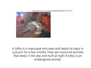 A bilby is a marsupial that carries its young in a pouch and is nocturnal, sleeping during the day and hunting at night. Bilbies live in deserts across Australia where they burrow underground and eat insects, seeds, fungi, small mammals, and lizards. Bilbies are endangered animals.
