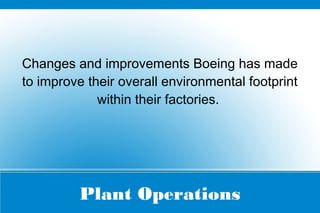 Boeing has taken significant steps to reduce its environmental impact through improvements to plant operations and new airplane models. At its plants, Boeing has increased recycling and reduced waste and hazardous materials. Its new airplanes like the 787 and 737 Max consume less fuel and make less noise. Boeing is also researching biofuels and technologies like solar cells and hydrogen-powered drones to make aviation more sustainable in the future.