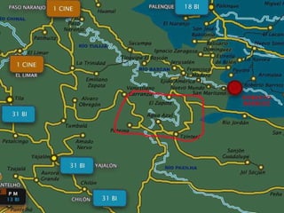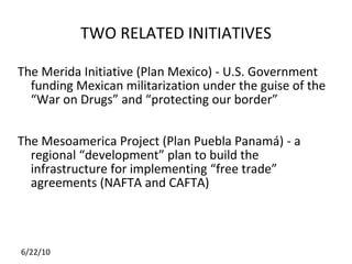 The document discusses the militarization of Mexico through initiatives like the Merida Initiative and the Mesoamerica Project, both linked to U.S. interests under the guise of combating drug trafficking and fostering economic development. It highlights various megaprojects, such as infrastructure development for tourism and energy, and community resistance against these developments, particularly in Chiapas. The text also touches on the environmental implications and the displacement of indigenous communities associated with these initiatives.