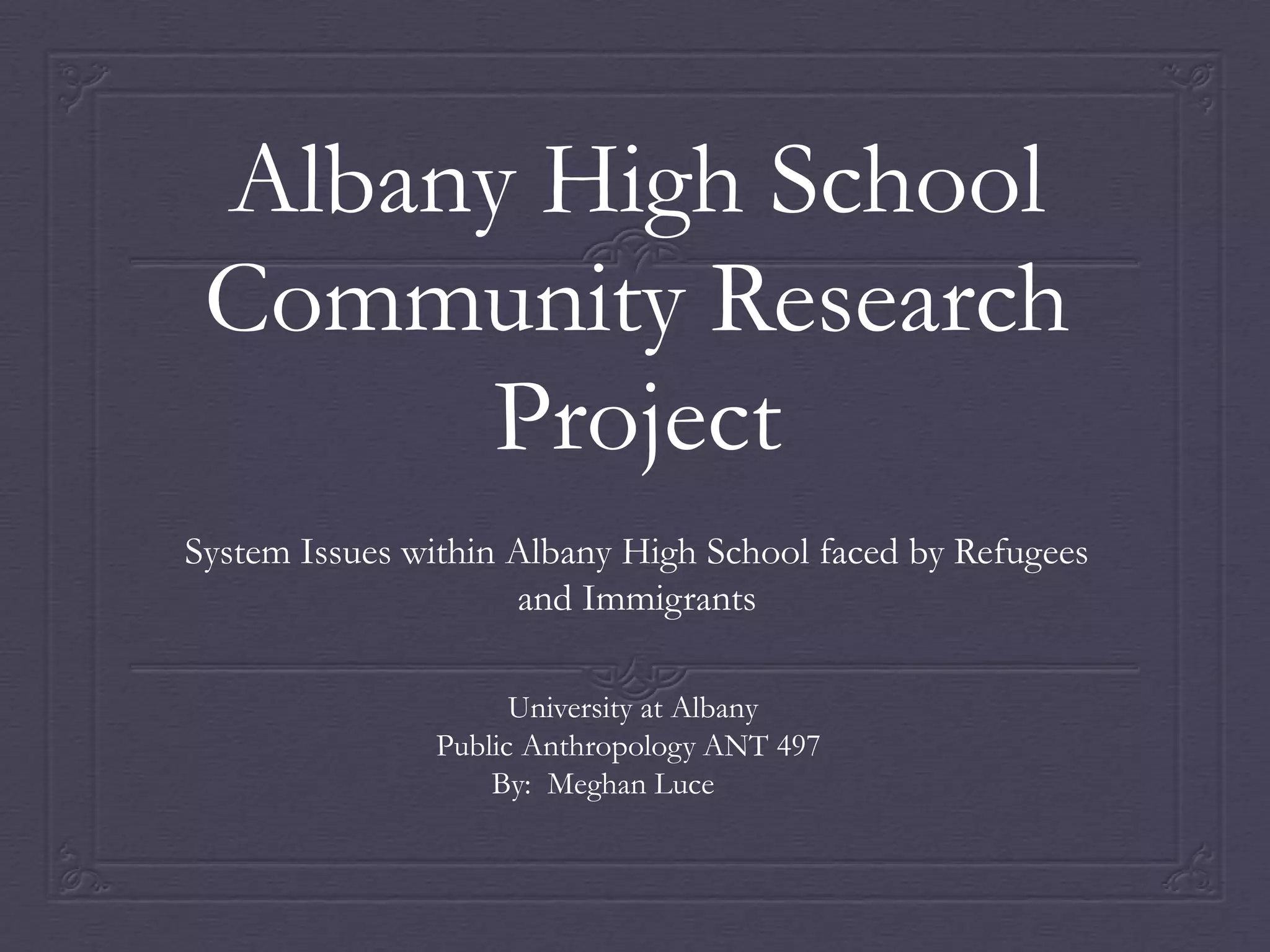 This document summarizes a research project on issues faced by refugee and immigrant students at Albany High School. It identifies a lack of support for teachers and students for their specific needs. There are not enough programs for academics, preparedness for exams, after-school activities, and cultural integration. The document analyzes exam scores, programs offered, and areas for improvement such as translating exams and considering students' experiences. It provides examples of successful programs for refugees elsewhere.