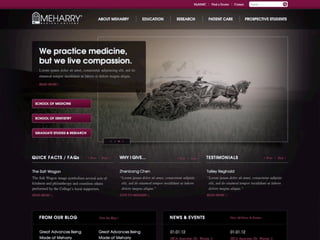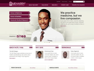 Meharry Medical College was redesigning their website and gathered feedback on a proposed design from various stakeholders including prospective students, donors, alumni, research patrons, patients, and current students and faculty. The feedback indicated that the bottom half of the design felt too boxy and dramatic, and suggested making it lighter and moving the school navigation to the left. It also recommended moving the social media links higher and providing more general examples in the featured content well. Based on this feedback, the web design firm Paramore would create interior page designs and revisions for approval before launching full development of the new website.
