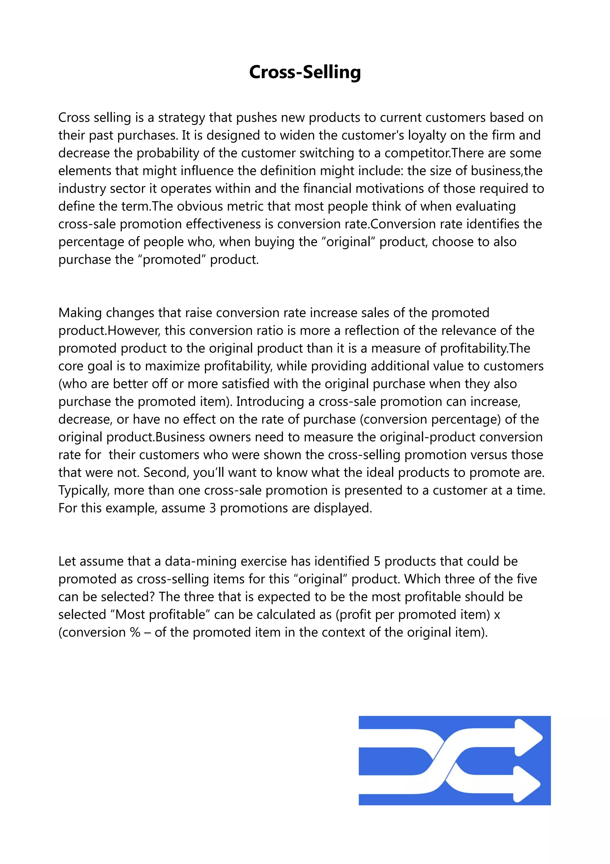 This document discusses strategies for cross-selling, which involves promoting additional products to customers based on their previous purchases. It provides eight ideas for improving cross-selling opportunities, such as letting natural opportunities arise and keeping suggestions relevant. It also stresses the importance of knowing customers well through data collection and CRM systems to increase loyalty and sales. Fear of risking the original sale or confusing customers are common reasons salespeople avoid cross-selling. Effective techniques include bundling products, offering various price points, and being observant of customer needs and behaviors.